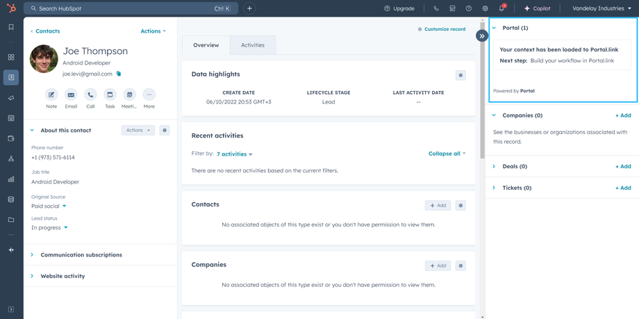 To verify that Portal is installed correctly, open a contact, company, deal, or ticket record and check for the default Portal widget.